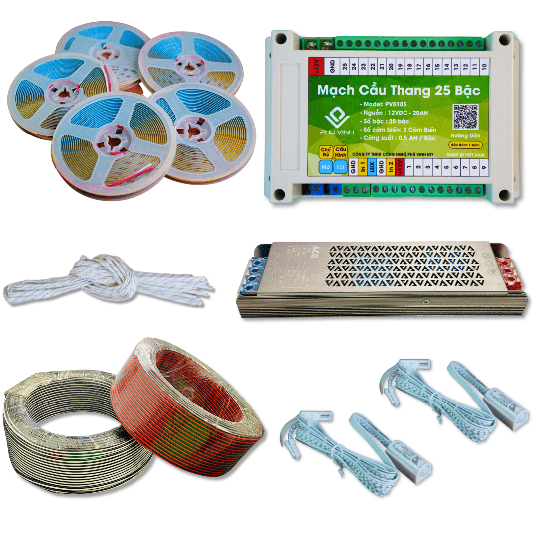 COMBO 02 bao gồm đầy đủ các vật tư cần thiết để bạn có thể dễ dàng lắp đặt và vận hành hệ thống chiếu sáng cầu thang thông minh: